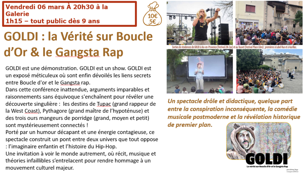 VOUS ÊTES ICI : mairiedefuveau.fr > Évènements > Spectacle – Goldi « La vérité sur Boucle d’Or & le Gangsta Rap »